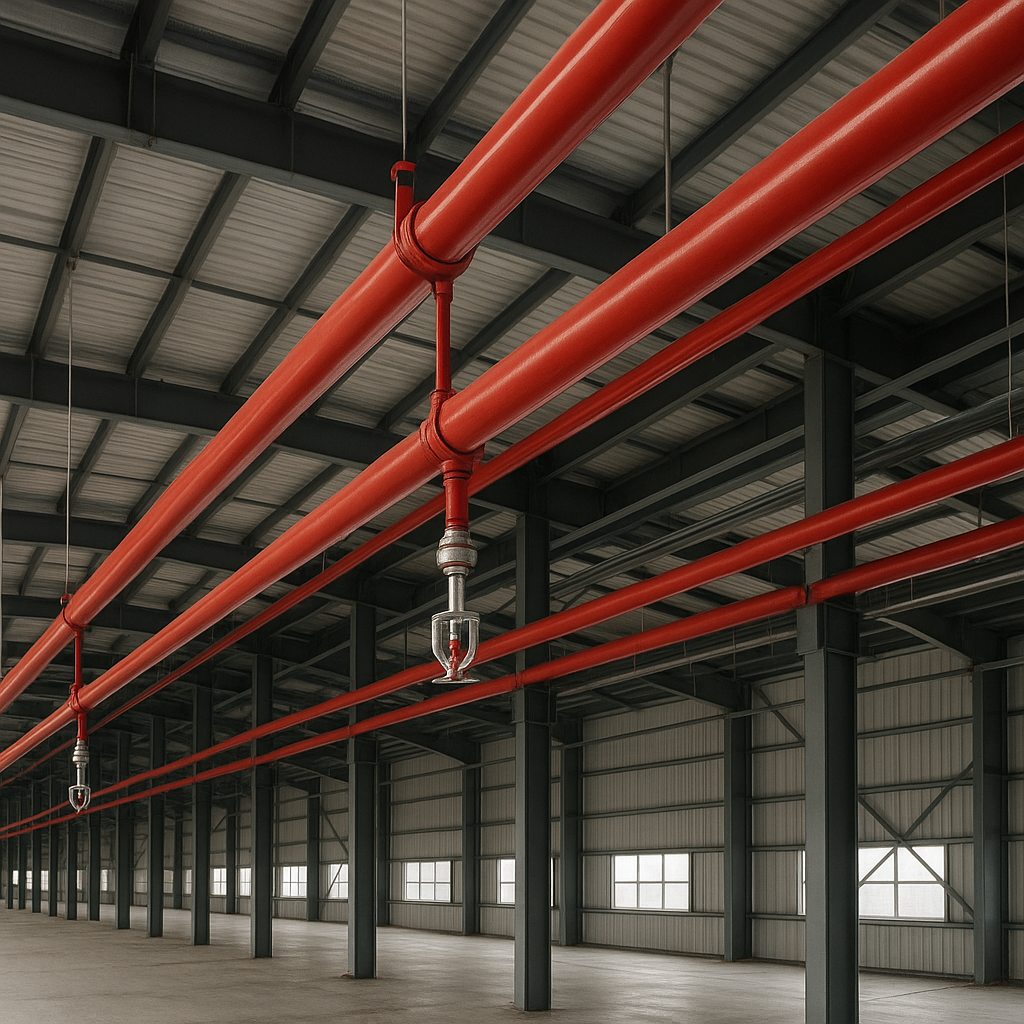 - Instalacja tryskaczowa (sprinklerowa) – automatyczny układ dysz wodnych lub mgłowych ograniczający rozwój ognia.
