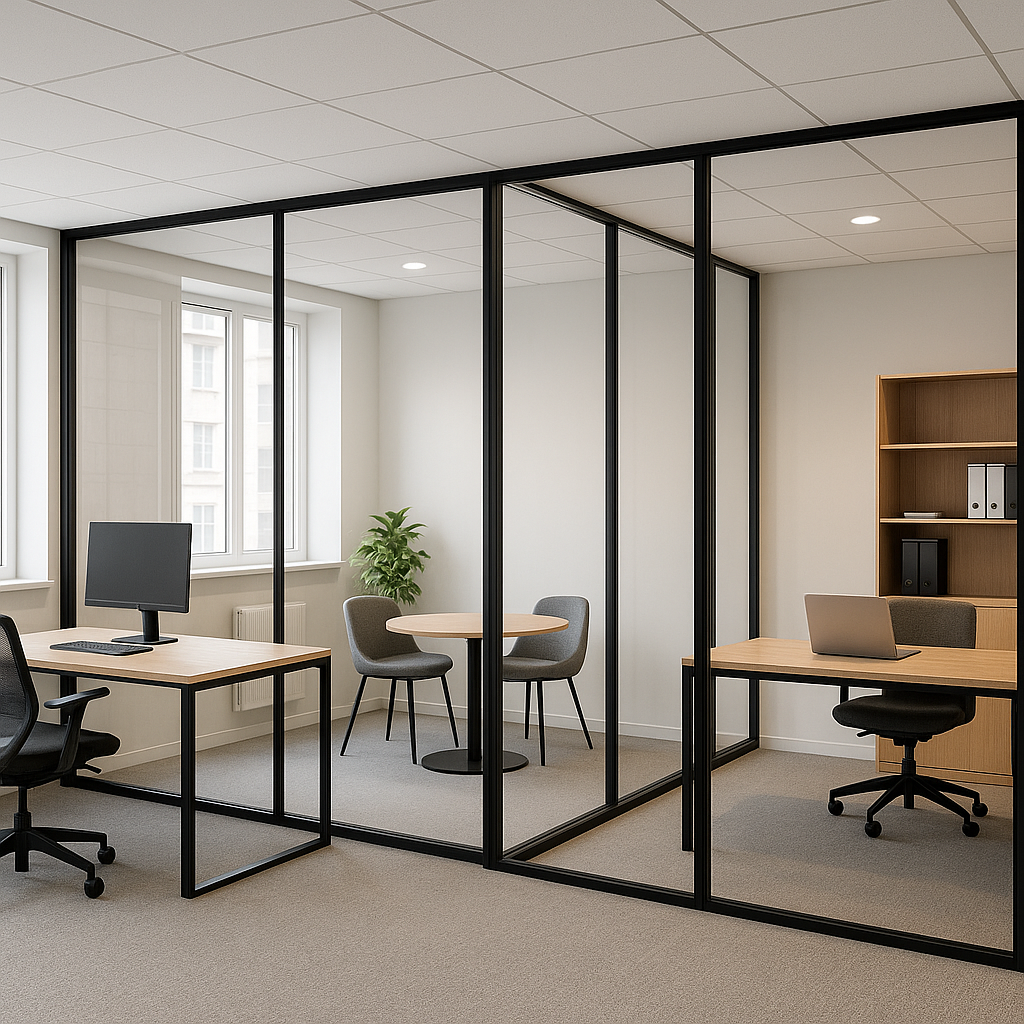 - przeszklone ścianki modułowe – do biur i pokoi konferencyjnych;